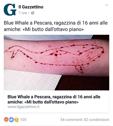 Il 24 maggio 2017 avevamo pubblicato la nostra analisi sul caso con il tag Analisi In Corso specificando che le informazioni erano ancora troppo sommarie per stabilire se il caso fosse reale o gonfiato dai media. Su altri quotidiani, infatti, le informazioni venivano alterate sia sull’età della ragazza che sui suoi trascorsi (sul Giornale si raccontava che avesse 13 anni) e sulla stampa locale si invitava alla prudenza, visto che la connessione tra la vicenda della ragazzina e la Blue Whale non trovava conferme.