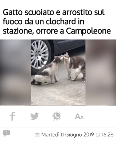 I nostri contatti ci segnalano uno screenshot ripreso da un articolo pubblicato sul Messaggero: il pezzo riporta il caso di un gatto arrostito ad Aprilia nei pressi della stazione ferroviaria di Campoleone. Troviamo l’articolo originale a questo indirizzo e notiamo che la notizia era stata pubblicata l’11 giugno 2019, una data che alcuni utenti ignorano credendo che si tratti di un fatto attuale, analogo a quanto successo a Campiglia.