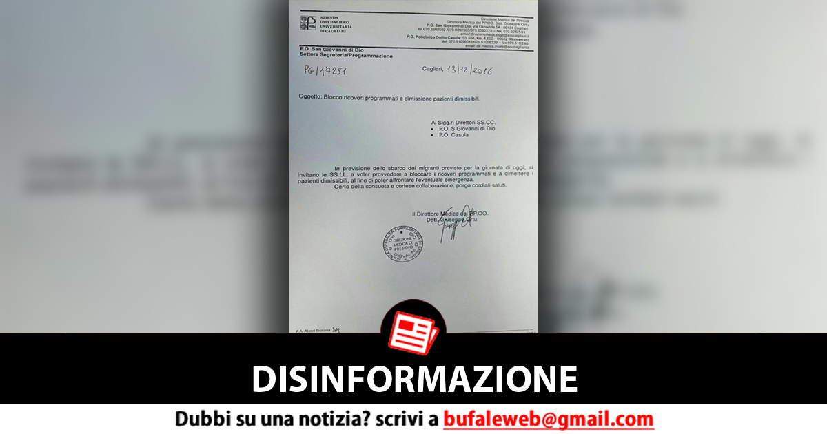 DISINFORMAZIONE Circolare Shock: “Bloccate i ricoveri italiani, arrivano i migranti…”