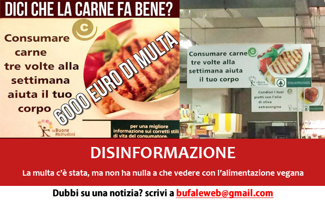 Circola nelle pagine Facebook vicine al mondo vegano questa immagine riportante un cartello con la scritta “Consumare carne tre volte alla settimana aiuta il tuo corpo” e l’annuncio di una multa per il valore di 6000 euro inflitta al supermercato “segnalato”.