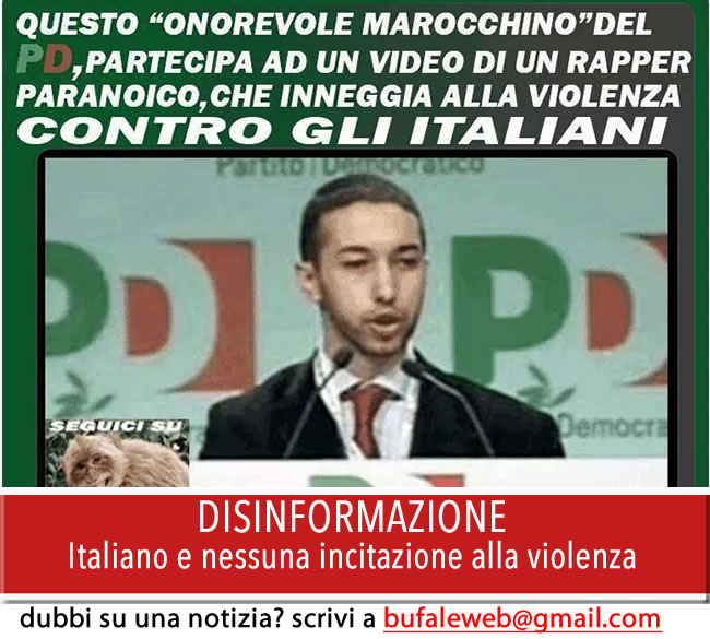 Ci segnalano i nostri contatti una immagine “macro” che starebbe nuovamente girando. Tale immagine, non senza un sottotesto denigratorio nei confronti del personaggio raffigurato, descrive l’onorevole Khalid Chouki (PD) come un “onorevole marocchino” che partecipa ad un “video di un rapper paranoico, che inneggia alla violenza verso gli italiani”.
