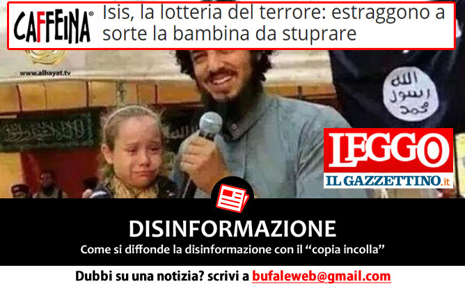 Ieri avevamo parlato dell’articolo disinformazione pubblicato dal sito Caffeinamagazine.it dal titolo “Isis, la lotteria del terrore: estraggono a sorte la bambina da stuprare“. Come abbiamo spiegato ai nostri lettori nella nostra pagina Facebook, siamo tutti consapevoli dell’esistenza di fatti orribili che accadono in tutto il mondo, ma le notizie vanno diffuse riportando i fatti senza alterarli per creare ulteriore scalpore, qualunque sia il tema. I fatti reali bastano e avanzano.