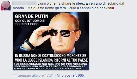 Tra i commenti del post c’è anche uno dello stesso proprietario dell’account, il quale condivide a sua volta una nota bufala riguardante Putin e gli islamici: