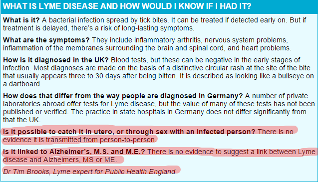 Nelle parti evidenziate di rosso: “E’ possibile prenderlo per via uterina, o attraverso il sesso con una persona infetta? – T.B: Non vi sono evidenze che dimostrino una trasmissione da persona a persona.” “E’ collegabile all’Alzahimer, Sclerosi Multipla e Encefalopatia Mialgica? – T.B: Non vi sono evidenze che dimostrino un collegamento tra la malattia di Lyme e l’Alzheimers, MS or ME.”