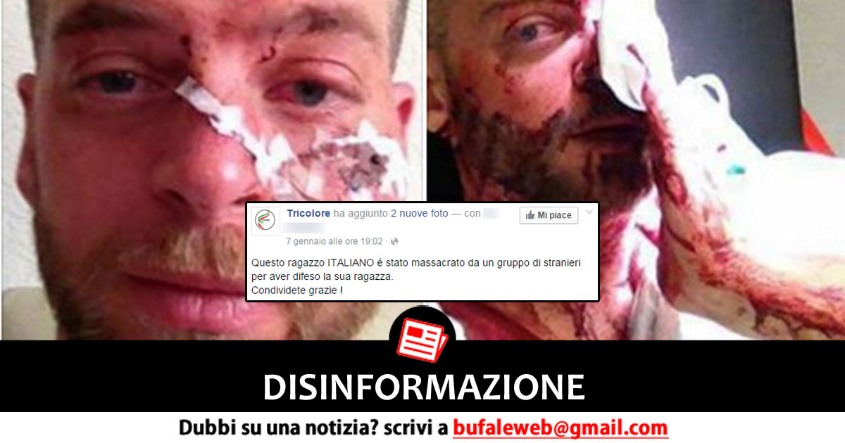 La pagina Facebook “Tricolore”, che fa leva sul patriottismo, dichiara che il ragazzo nelle foto sia un “ITALIANO”, tutto in maiuscolo per risaltarne la nazionalità, è stato coinvolto in uno scontro con degli stranieri per aver difeso la sua ragazza. In verità questa pagina Facebook sfrutta proprio il patriottismo italiano per far abboccare gli utenti facendo credere loro quanto raccontato.