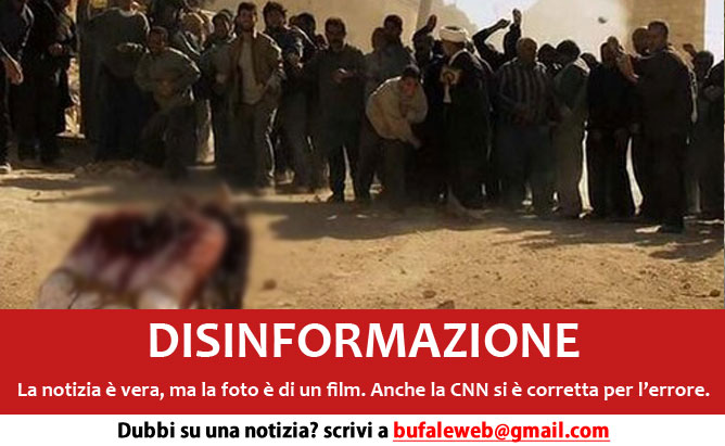 Questa foto è stata riportata in varie forme e dimensioni da molti siti internet, anche italiani (esempio 1 , 2 , 3, 4). Raccontano la storia vera di una donna lapidata per adulterio in Siria, ma la foto è tratta da un film documentario del 2008 intitolato “The Stoning of Soraya M.“.
