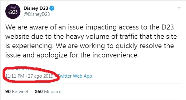 - In secondo luogo, l’articolo faceva riferimento a fonti piuttosto attendibili apparentemente. Citava sia il fan club ufficiale di Disney (Disney D23) che i relativi account Facebook e Twitter. A ingannare, un tweet in cui si affermava che il sito del fan club era offline a causa di un elevato numero di utenti connessi, un volume di traffico insolitamente alto dovuto proprio ai tentativi di registrazione dei tanti che si stavano accaparrando l’offerta. Ma la verità è che il tweet in questione risale al 27 agosto e, ammesso che sia esistito un problema di traffico sulla piattaforma, di certo la causa non erano gli accessi effettuati in nome di una promozione in definitiva inesistente.