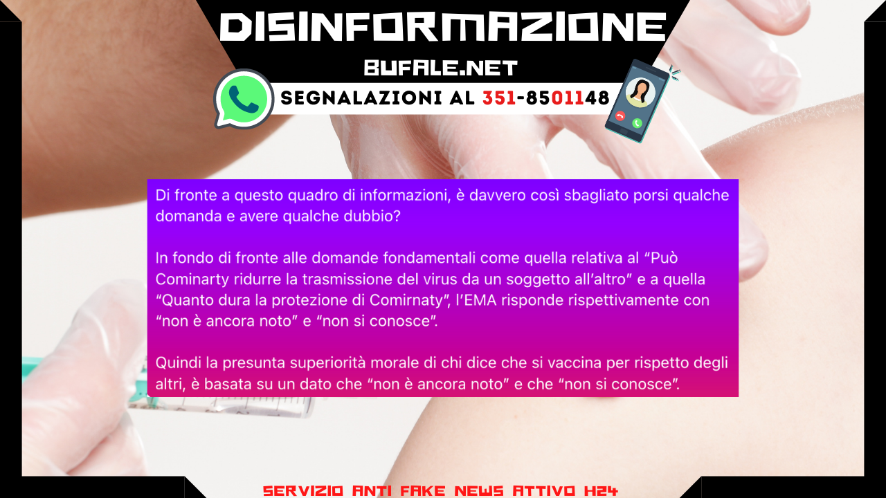 Quindi la presunta superiorità morale di chi dice che si vaccina per rispetto degli altri, è basata su un dato che “non è ancora noto” e che “non si conosce”