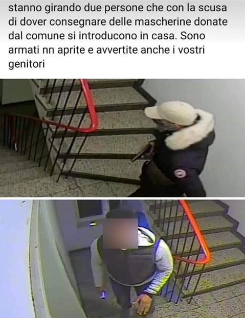 Secondo un post che rischia di diventare virale due persone armate si aggirerebbero per gli appartamenti di un luogo non definito con la scusa di consegnare mascherine donate dal Comune. Il post include le foto di due uomini catturate da un sistema di videosorveglianza.