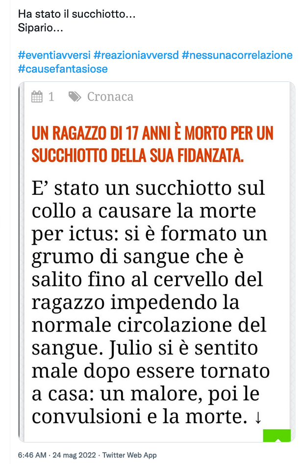 Ci segnalano un tweet che contiene una (vedremo infondata) correlazione tra COVID19 e un succhiotto del 2016. Ovviamente il riferimento è all’hashtag #nessunacorrelazione, usato spesso per diffondere una teoria del complotto secondo cui i vaccini sono latori di tutte le morti condivise sui social dal 2019 ad oggi, e che i “poteri forti” nascondano la correlazione.