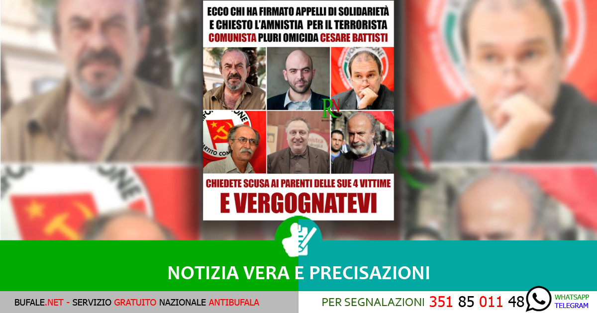 Il post di Riscatto Nazionale si riferisce principalmente alla raccolta firme organizzata da Carmilla Online nel 2004 per chiedere l’amnistia di Cesare Battisti. Tra i firmatari c’era anche Roberto Saviano, che però nel 2006 disconobbe la sua adesione in una lettera pubblicata da Carmilla Online nella quale dichiarava che la sua sottoscrizione era arrivata lì per chissà quale strada del web. Sulla posizione di Roberto Saviano vi rimandiamo al nostro articolo dedicato.