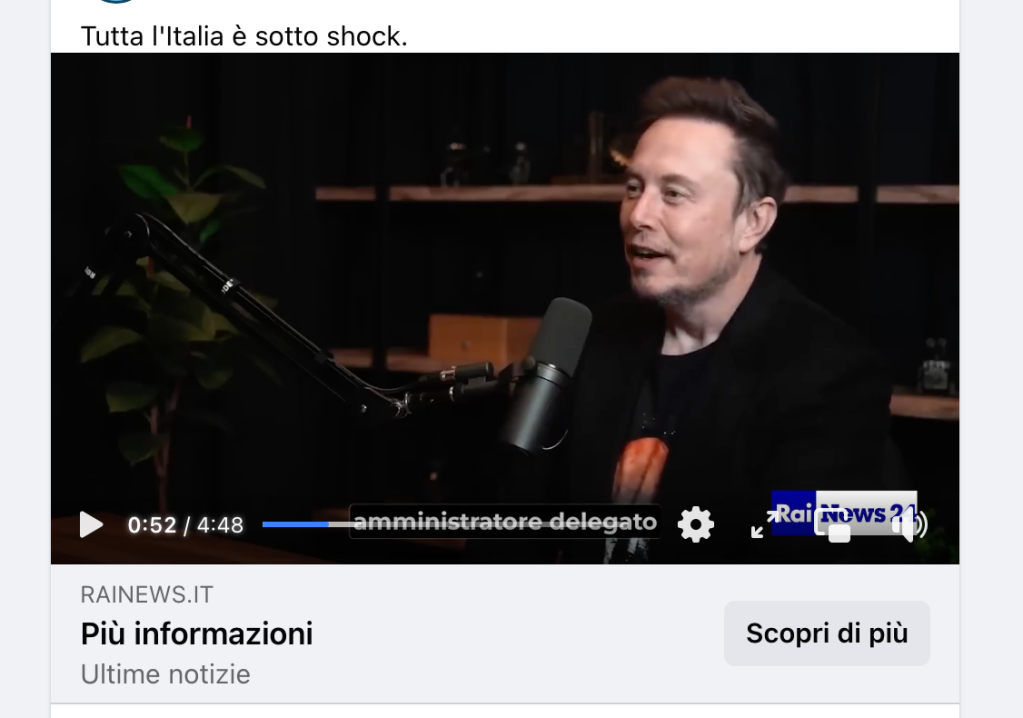 Un finto spezzone di “Rainews” (che però conduce ad un sito che ovviamente non è quello della RAI) dove una giornalista ridoppiata dalle AI presenta un deepfake di Elon Musk intento a vendere una nuova “rivoluzionaria piattaforma per le cryptovalute”, ottenuto ritoccando un’intervista del magnate per Zuby.