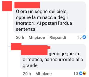 Quel “piacevolmente sorpreso”, probabilmente, sottintende che le scie a forma di croce possano essere una sorta di benedizione divina sulla manifestazione. Insomma, le scie chimiche “hanno fatto anche cose buone”? Ed è proprio questo dettaglio ad aver fatto scattare un autentico corto circuito tra i follower di Montesano, tra chi sostiene che si sia trattato di un segnale divino e chi invece non ha dubbi sul fatto che siano scie chimiche e quindi un qualcosa di assolutamente negativo, messo in essere dei soliti Poteri Forti. Chissà, magari Montesano voleva trollare i suoi fans? Se così fosse, ci è riuscito benissimo. Ecco qualche esempio tratto dalla sezione commenti del post: