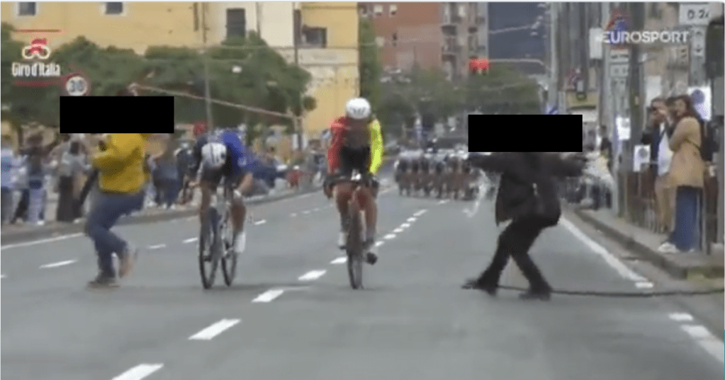Entra con un tubo alla sesta tappa del Giro di Italia: denunciato a piede libero. Questo il riassunto di un video virale che ci è stato segnalato e che presenta un personaggio che presenta due personaggi che cercano di intralciare il passo dei ciclisti del Giro di Italia di tappa a Napoli.