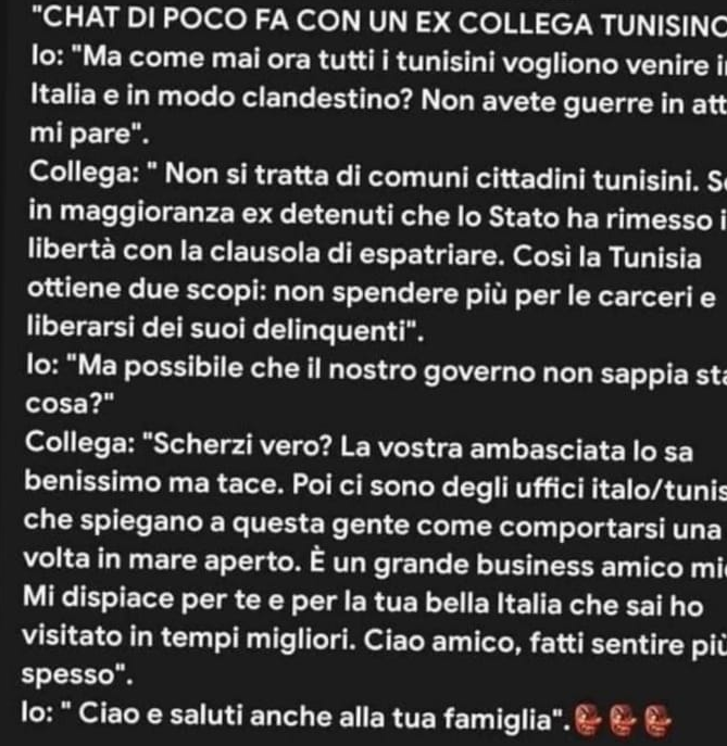 Io: “Ma come mai ora tutti i tunisini voglio venire in Italia e in modo clandestino? Non avete guerre in atto mi pare”
