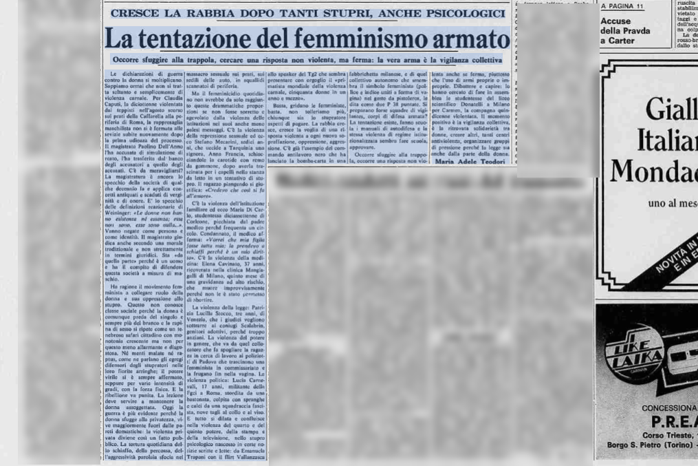 La fonte citata, come già detto, è un articolo pubblicato da Teodori su Stampa Sera il 4 aprile 1977. Il riscontro esiste. Lo troviamo nell’archivio del quotidiano torinese sotto il titolo La tentazione del femminismo armato. Per chi ha curiosità e piacere, della rabbia femminista abbiamo parlato in un articolo che riportava un vecchio commento pubblicato da Lidia Ravera sulla rivista Muzak in cui l’autrice commentava il massacro del Circeo. Ora, torniamo a noi.