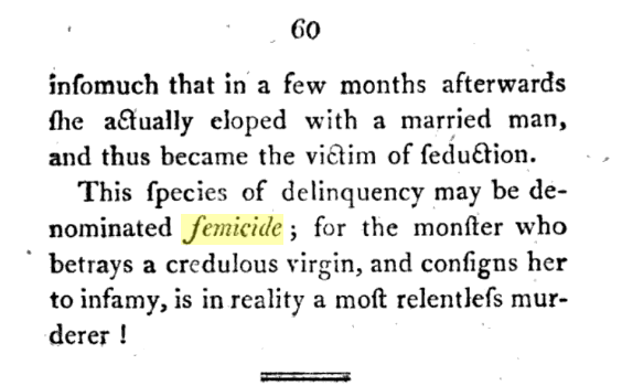 Un altro studio sull’origine del termine femminicidio lo troviamo nel lavoro della criminologa Diana E.H. Russell. A pagina 27 del volume Strengthening understanding of Femicide è riportato che nel 1801 fu usato per la prima volta il vocabolo femicide (femicidio) a pagina 60 della pubblicazione The Satirical Review of London at the Commencement of the Nineteenth Century per indicare l’azione dell’uomo che costringe la donna al primo atto sessuale.
