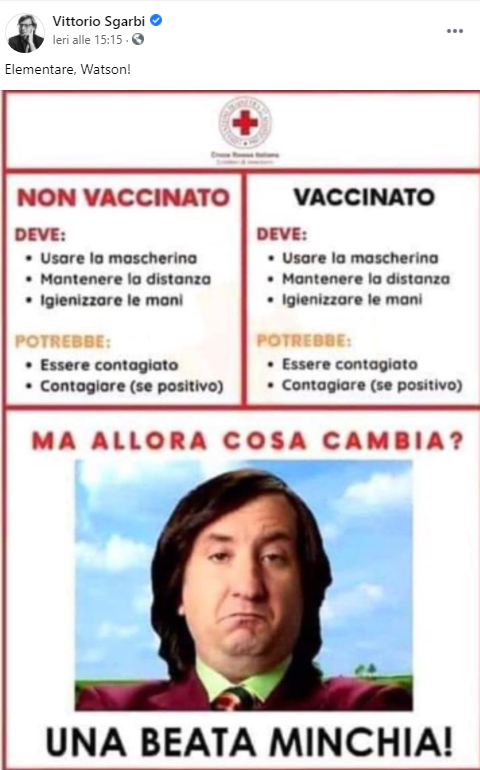 Che è successo a Vittorio Sgarbi con la Croce Rossa? Il critico d’arte ha condiviso una fake news attribuita alla Croce Rossa, un’infografica di quelle che “miocuggino informato le fa gratis” nel tentativo di dimostrare che non vi sarebbe differenza tra vaccinati e non vaccinati in termini di restrizioni e rischi. È quanto accaduto ieri, 29 maggio 2021, sulla sua pagina Facebook.