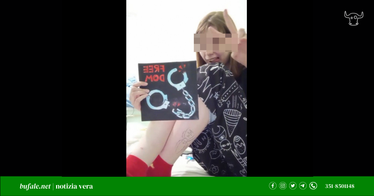 La fanciulla si vede esibire un cartello con scritto “libertà” e sfilarsi la cavigliera che era stata obbligata a indossare, oltre al divieto espresso di comunicare col mondo esterno (familiari compresi) in attesa di una condanna praticamente già scritta.