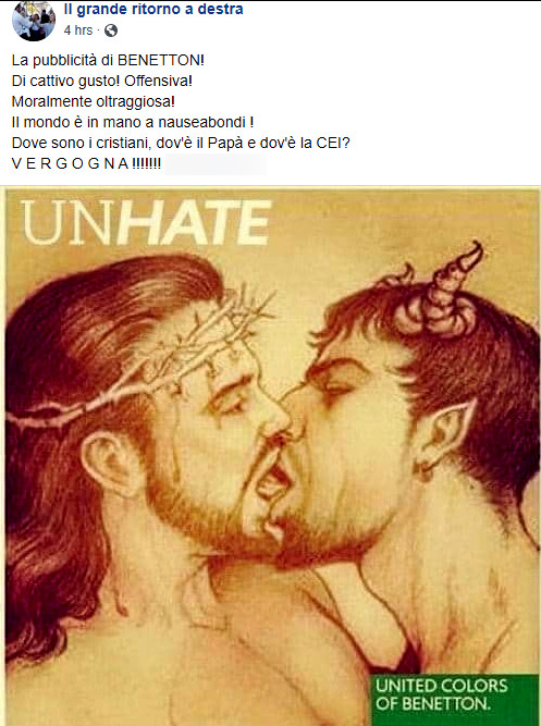 Era già stata smentita, ma con la complicità della pagina Facebook Il grande ritorno a destra si ritorna a parlare di una vecchia bufala che interessa la campagna UnHate promossa nel 2011 da Benetton. In un post pubblicato nelle ultime ore viene riproposto il manifesto che mostra il bacio tra Gesù Cristo e Satana.