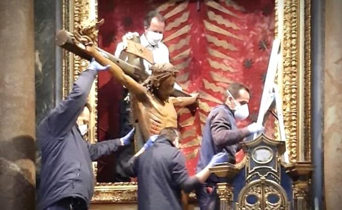 Il crocifisso era stato trasportato in Vaticano in quanto gli vengono riconosciuti due miracoli: il primo nel 1519 quando fu l’unico elemento scampato da un incendio che devastò la chiesa che lo ospitava. Il secondo nel 1522 durante la peste, quando fu portato in processione per penitenza e l’epidemia si fermò. La fine della peste venne dunque attribuita a un miracolo di quel crocifisso.