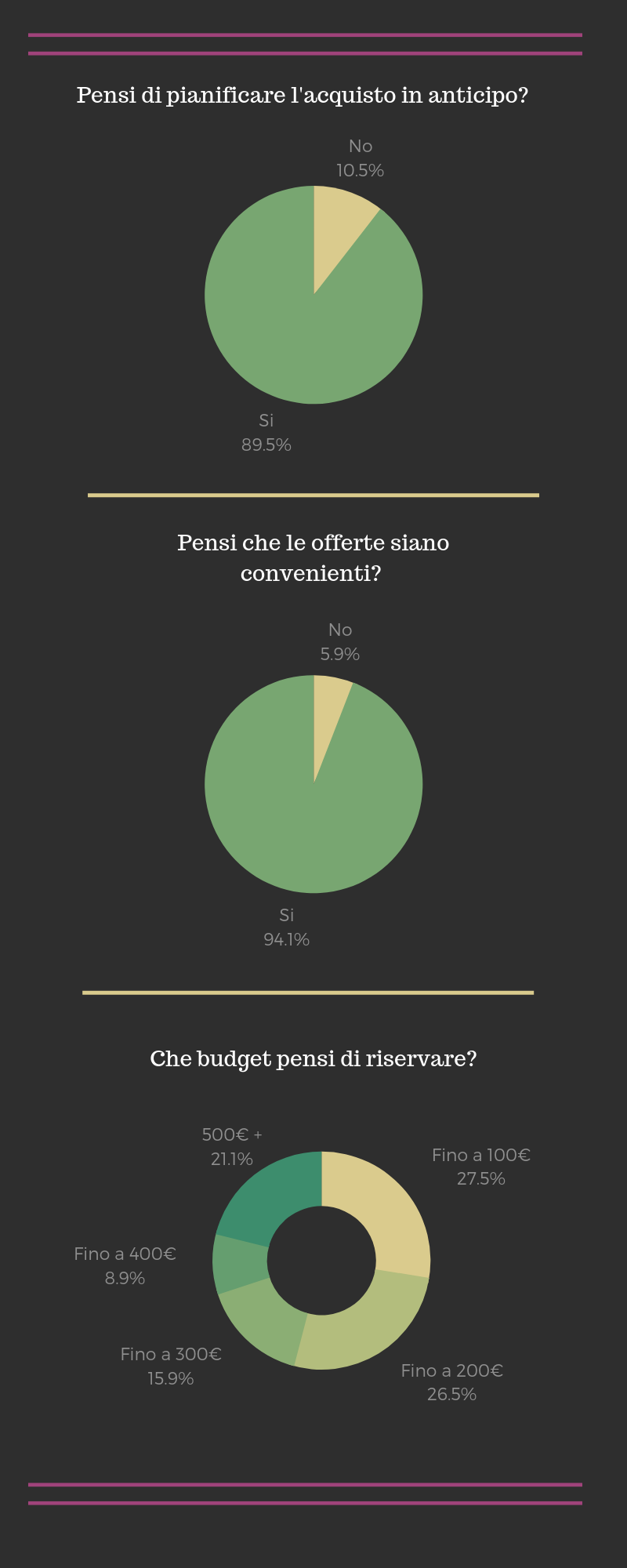 Il 94% del campione esaminato ritiene le offerte solitamente presentate in occasione del Black Friday decisamente convenienti. A darne ulteriore testimonianza è il fatto che questo giorno sia ormai divenuto l’evento più atteso dell’anno. Per quanto riguarda il budget, qui le percentuali sono più equilibrate. Se il 27,5% ha dichiarato di non voler riservare più di 100 euro per gli acquisti, il 26,5% aumenterà il budget a 200 euro. A sua volta, il 16% circa è disposto ad arrivare a 300 euro, il 10,9 a 400 euro, mentre 21% ha nella cifra di 500 euro il punto di arrivo. L’ultimo dato è il più sorprendente, in quanto evidenzia come ben 1 persona intervistata su 5 non sia intenzionata a porsi particolari limiti. A cogliere con piacere questi risultati sono gli operatori del settore vendite, certi di poter replicare gli ottimi risultati ottenuti negli ultimi anni.
