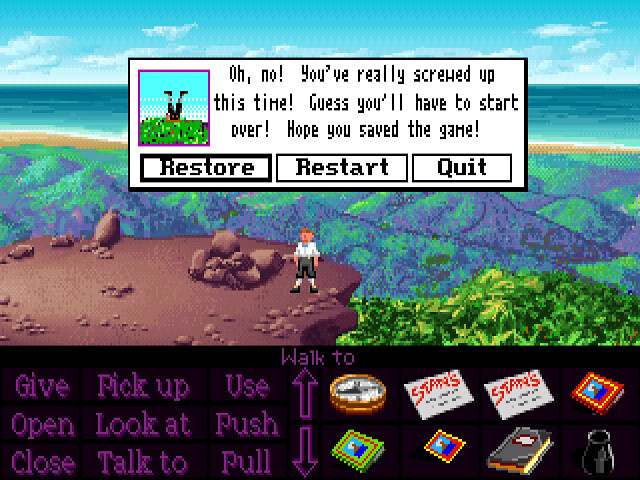 Siccome Monkey Island nacque come risposta alle frustanti avventure grafiche Sierra dove era possibile morire o rimanere bloccati, ecco che Guybrush, praticamente immortale, nel primo capitolo può morire se, dopo aver dichiarato di poter trattenere il fiato per dieci minuti, viene lasciato sott’acqua per dieci minuti e un secondo (nell’ultimo sequel, moderno, semplicemente nella “storia cornice” suo figlio gli dirà che se non la smette di darsi per morto per non raccontare il seguito se ne andrà via interrompendo la narrazione…), e cadendo da un precipizio, viene prima accolto dalla schermata di morte tipica dei giochi Sierra, per poi ritornare in scena dicendo di essere “rimbalzato su un albero della Gomma”.