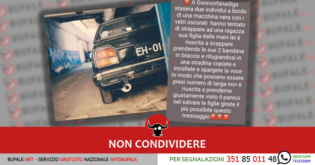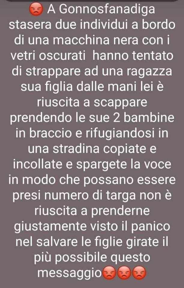 A Gonnosfanadiga stasera due individui a bordo di una macchina nera con i vetri oscurati hanno tentato di strappare ad una ragazza sua figlia dalle mani lei è riuscita a scappare prendendo le sue 2 bambine in braccio e rifugiandosi in una stradina copiate e incollate e spargete la voce in modo che possano essere presi numero di targa non è riuscita a prenderne giustamente visto il panico nel salvare le figlie girate il più possibile questo messaggio
