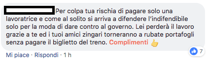 Ma prima o poi, a forza di far così, quello sbagliato lo trovate… ormai sei e siete arrivati al limitePer colpa tua rischia di pagare solo una lavoratrice e come al solito si arriva a difendere l’indifendibile solo per la moda di dare contro al governo. Lei perderà il lavoro grazie a te ed i tuoi amici zingari torneranno a rubate portafogli senza pagare il biglietto del treno. Complimenti