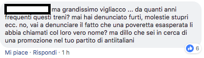 ma grandissimo vigliacco … da quanti anni frequenti questi treni? mai hai denunciato furti, molestie stupri ecc. no, vai a denunciare il fatto che una poveretta esasperata li abbia chiamati col loro vero nome? ma dillo che sei in cerca di una promozione nel tuo partito di antiitaliani