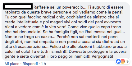 Raffaele sei un poveraccio… Ti auguro di essere rapinato da queste brave persone e poi vediamo come la pensi! Tu con quel faccino radical chic, occhialetti da sinistro che si crede intellettuale e poi magari vivi coi soldi del papi avvocato… Vieni a vedere com’è la vita vera! Come vive quella capo treno che hai denunciato! Se ha famiglia figli, se l’hai messa nei guai… Non te ne frega un cazzo… Perché non sai metterti nei panni degli altri, non hai empatia e non pensi a cosa ci sia dietro ad un atto di esasperazione… Felice che alle elezioni ti abbiano preso a calci nel culo! Tu e tutti i sinistri!!! Dovevate proteggere la povera gente e siete diventati i loro peggiori nemici!!! Vergognati!