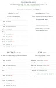 Andando ad interrogare il Whois del sito Resistenzanazionale.com notiamo che anch’esso è protetto dal sistema di privacy utilizzato anche per il dominio VoxNews.info, ma non è sempre stato così. Dall’interrogazione registrata in data aprile 2014 i dati relativi al proprietario sono in chiaro e con un particolare che vedremo in seguito: