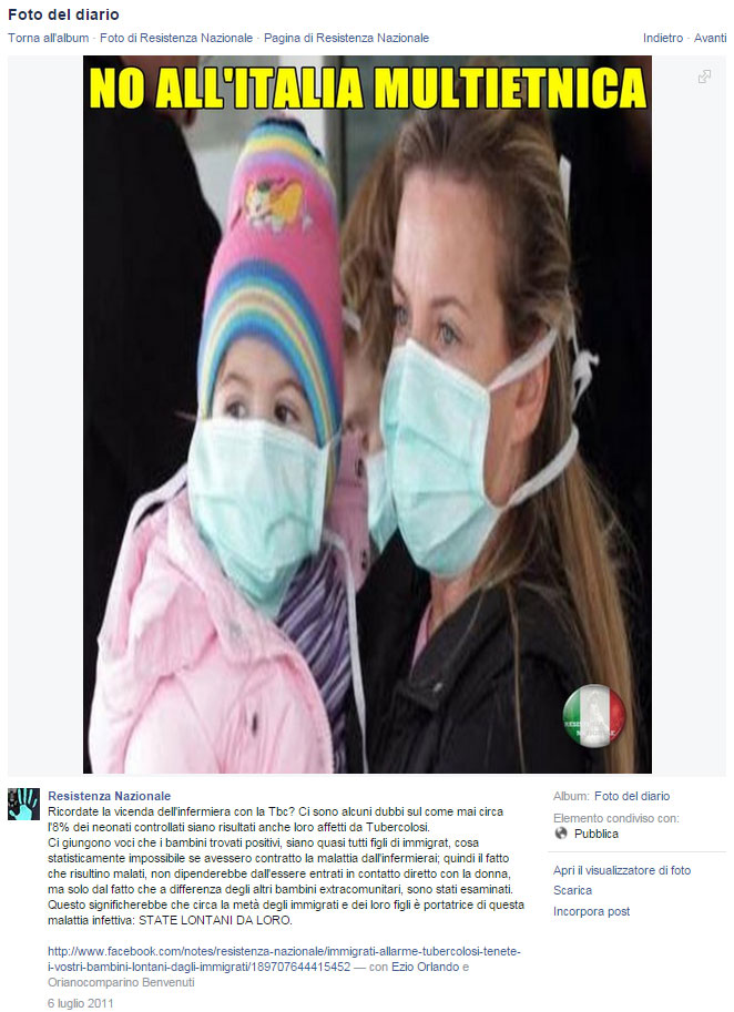 Dall’altra parte, in alto nella colonna sinistra, troviamo un’immagine con la scritta “No all’Italia multietnica” che rimanda ad un post della pagina Facebook di “Resistenza Nazionale“.