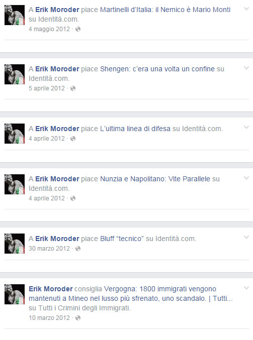 Un altro account chiamato Erik Moroder, non collegabile a “Gianni”, commenta di tanto in tanto nelle varie pagine Facebook, oltre a VoxNews anche nella nostra, in altre per criticare gli articoli altrui che abbiano a che fare con lo stesso Vox e il tema immigrazione. Le condivisioni nel suo profilo e i “mi piace” fanno capire il legame con i siti collegati a Resistenza Nazionale e VoxNews.