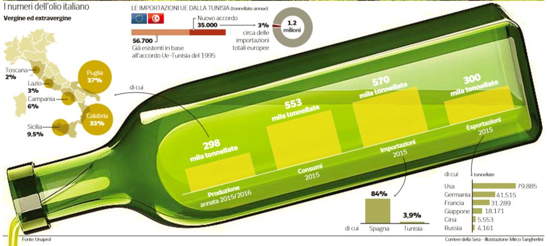 Il Corriere della Sera parla di ben 570 mila tonnellate d’olio importato nel 2015.