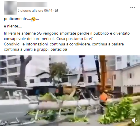 Un video pubblicato sui social mostrerebbe il momento in cui un’antenna 5G in Perù viene smantellata. “Il pubblico è diventato consapevole del pericolo”, racconta chi condivide il filmato. Della disinformazione sul 5G abbiamo parlato in tantissime occasioni (qui il nostro archivio). L’argomento, infatti, è reso divisivo dalle tante teorie del complotto che mettono insieme le antenne, il Covid, le malattie e talvolta il Nuovo Ordine Mondiale.