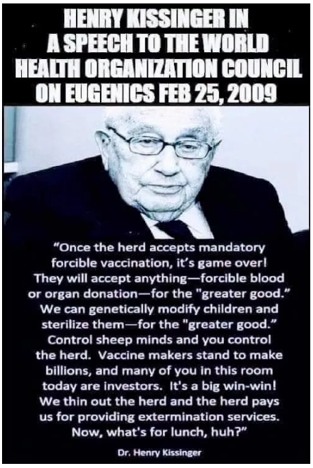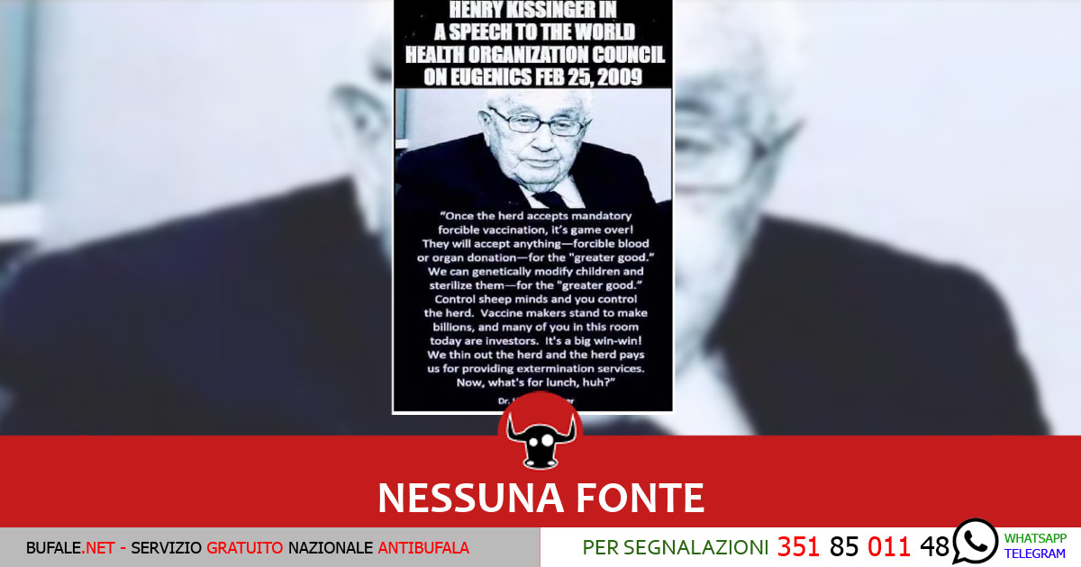 Un meme del 2019 postula che Henry Kissinger, ex consigliere della sicurezza nazionale e segretario di stato degli Stati Uniti durante le amministrazioni Nixon e Ford, abbia pronunciato un discorso a un consiglio dell’Organizzazione mondiale della sanità (OMS) sull’eugenetica nel 2009 in cui dichiarò che il primo passo per controllare le popolazioni era di indurli ad accettare le vaccinazioni obbligatorie.