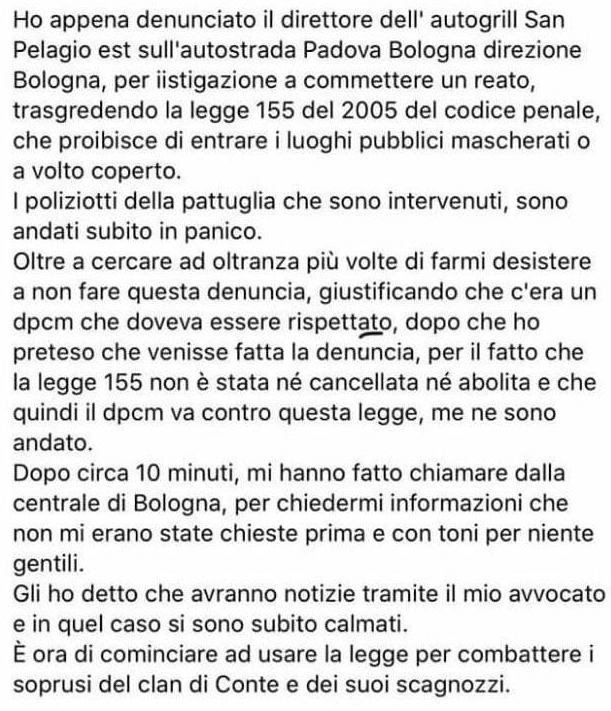 “Ho denunciato il direttore dell’Autogrill che ha trasgredito la legge del codice penale”: mascherine e divieto di volto coperto