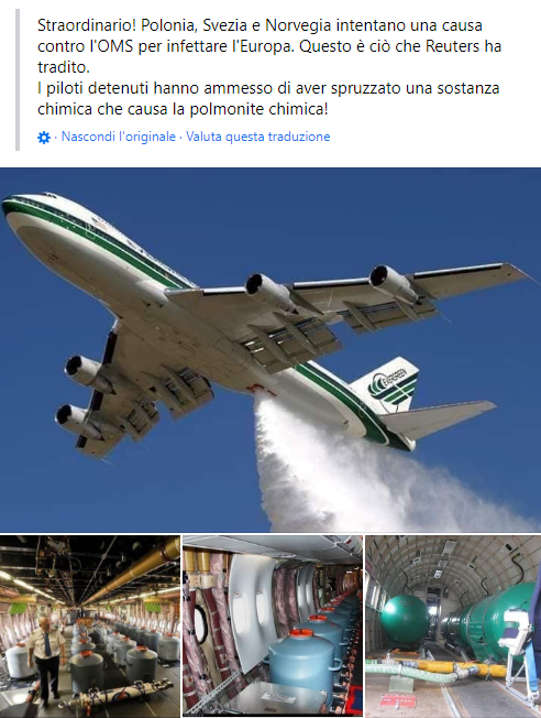 Sì, sul Covid causato dalle scie chimiche per infettare il mondo intero ne abbiamo sentite tante ma a questo giro, dalla Russia, arriva la teoria della polmonite chimica. I nostri lettori ci segnalano un post pubblicato su Facebook da un account palesemente fake il 22 dicembre 2020. Chi pubblica il post aggiunge delle fotografie che dimostrerebbero la presenza di bidoni di sostanze chimiche a bordo dei velivoli, un maldestro scacco matto ai poteri forti. Ancora una volta i complottisti inciampano sulle loro stesse convinzioni infettando altri utenti, però, con la loro infodemia tossica.
