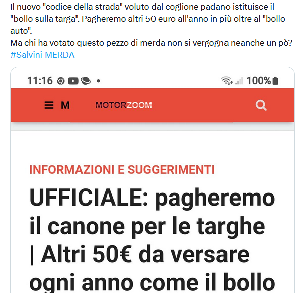 Ci segnalano un post X che accusa il Ministro delle Infrastrutture di aver inserito nella riforma del CdS un canone di 50 euro per le targhe “come il bollo”, da versarsi annualmente come per il bollo, dichiarando che tutti gli automobilisti pagheranno 50 euro in più.