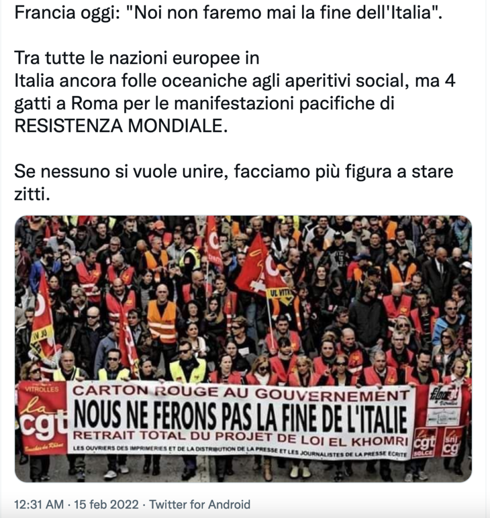 Ma questo non ha impedito di riciclarlo per “gonfiare” le manifestazioni nopass/novax di questi giorni. Nello stile a cui siamo purtroppo abituati.