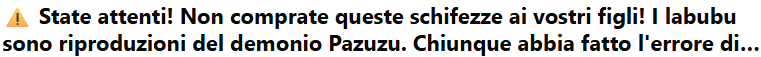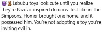 Il culmine di queste speculazioni è arrivato quando alcuni utenti di internet hanno cominciato ad associare i Labubu al demone Pazuzu, una figura antica e terrificante della mitologia mesopotamica. Immagini dei pupazzi venivano fatte circolare accostate a frasi allarmanti come: “Non comprate questo giocattolo demoniaco ai vostri bambini!”.