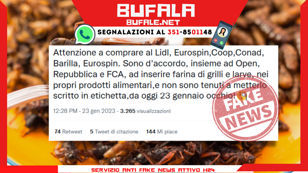 Secondo tale bizzarra teoria una cospirazione comprendente Lidl, Eurospin, Coop, Conad, Barilla e, non abbiamo capito perché due volte Eurospin, con la collaborazione di Repubblica, FCA e Open (che non sapevamo vendessero pasta) intendono inserire farina di grilli e larve nei prodotti alimentari senza dirlo, da oggi.