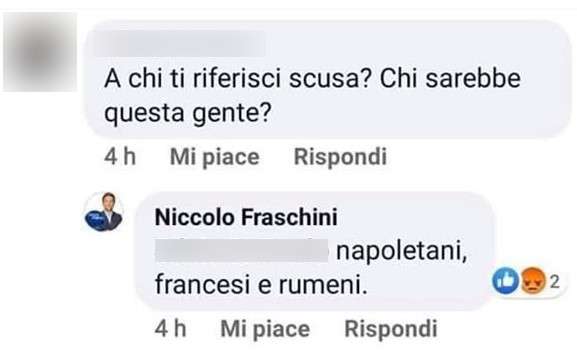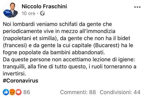 È delle ultime ore lo shitstorm contro il consigliere di Pavia Niccolò Fraschini che dopo aver pubblicato un post sul Coronavirus con pesanti insulti rivolti a napoletani, francesi e romeni ha rimosso tutto, ma non abbastanza in tempo per evitare di essere farsi bersaglio di feroci polemiche. Feroci sì, ma mai quanto le parole che egli stesso non nega ma tenta di giustificare.