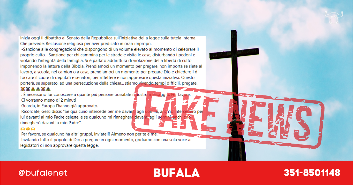 Secondo tale testo infatti, peraltro redatto in un modo meccanico, artificioso e pieno di errori che fa pensare (correttamente) ad una traduzione a mezzo Google di un testo straniero, il Senato Italiano starebbe approvando una legge per la “reclusione religiosa” che di fatto impedirebbe l’insegnamento delle religioni nelle scuole, la predicazione e persino la preghiera.