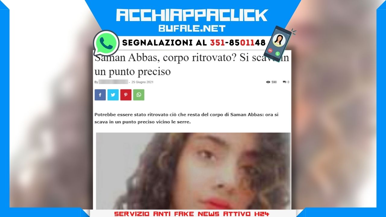 I nostri lettori ci fanno notare alcuni titoli acchiappaclick comparsi in rete. È il caso di CheNews (20 giugno), InformaPress (25 giugno) e CiaoStyle (25 giugno). CheNews, in particolare, il 20 giugno titolava: “Trovata Saman, la famiglia vuota il sacco: ecco dov’è”. Il corpo di Saman non è stato ritrovato.