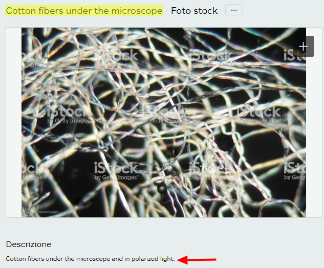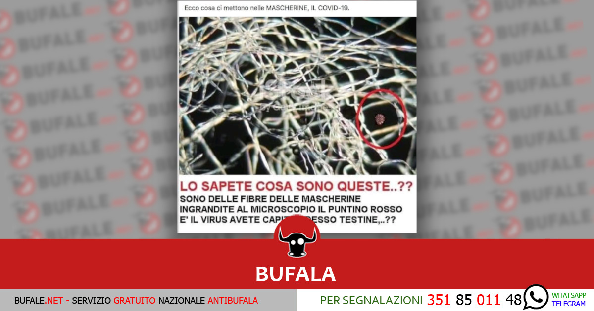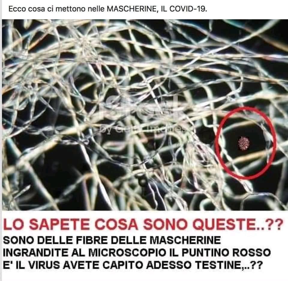 Nella descrizione leggiamo che si tratta di fibre di cotone catturate al microscopio con luce polarizzata. Soprattutto, la macchiolina rossa che mostrerebbe la presenza del SARS-CoV-2 tra le fibre non è presente. Siamo dunque di fronte a una bufala: nessun virus tra le fibre delle mascherine, soltanto un fotomontaggio operato su un’immagine facilmente reperibile sul web.
