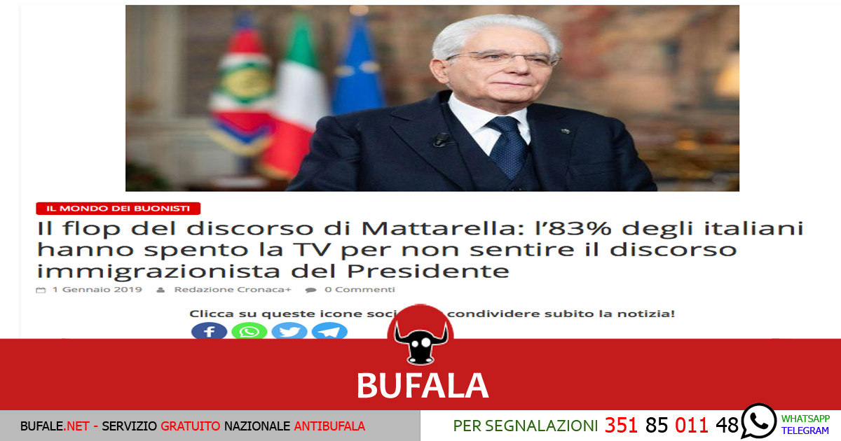 Di solito riportiamo il titolo preciso di una bufala: ma davanti ad una bufala che confina con l’oltraggio, ci rifiutiamo categoricamente di fare da megafono delle basse insinuazioni di “portali” che ci deliziano con “titoli” come Il flop del discorso di Mattarella: l’83% degli italiani hanno spento la TV per non sentire il discorso immigrazionista del Presidente, con tanto di vergognoso sottopancia “il mondo dei buonisti”