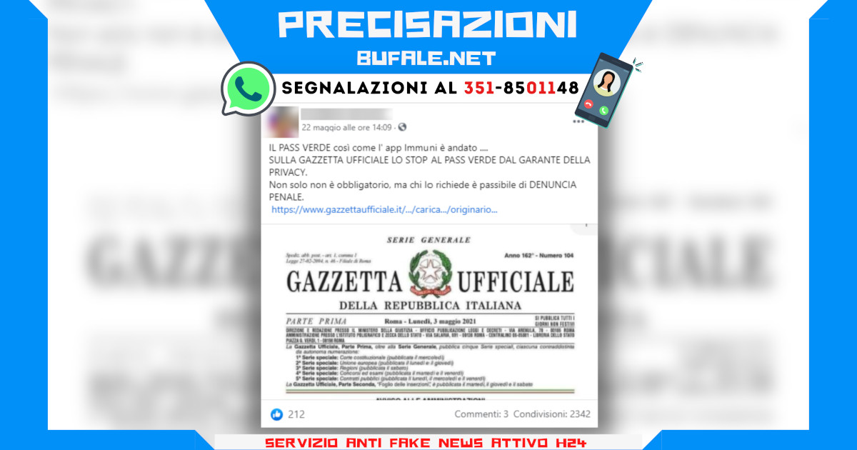 SULLA GAZZETTA UFFICIALE LO STOP AL PASS VERDE DAL GARANTE DELLA PRIVACY.