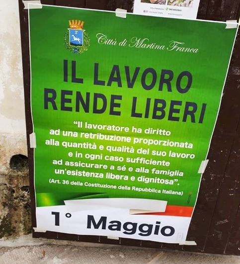 Un articolo pubblicato su Martina News ci mostra un manifesto comparso a Martina Franca (Taranto) nel quale era ben visibile la frase “Il lavoro rende liberi” accompagnata dalla citazione di un articolo della Costituzione Italiana.